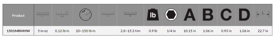 The 1501MRMHW Mechanical Micro-Adjustable Torque Wrench is simple to use, fast and accurate with easy-to-read laser marked scales. Great for industrial, automotive, aerospace, motorcycle, watercraft and aircraft applications.