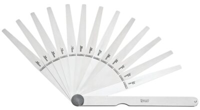 The Starrett English Thickness Gauge is used in automotive, aviation, diesel, and farm equipment manufacture and service and also in jig, fixture, gauge, and experimental work. Especially useful in adjusting tappets, spark plugs, distributor points, checking bearing clearances and gear play, fitting pistons, rings, and pins, and gauging narrow slots.