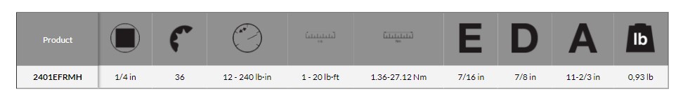 | 2401EFRMH | (1.36 to 27.12) N.m | (1 to 20) ft.lbf | (12 to 240) in.lbf |